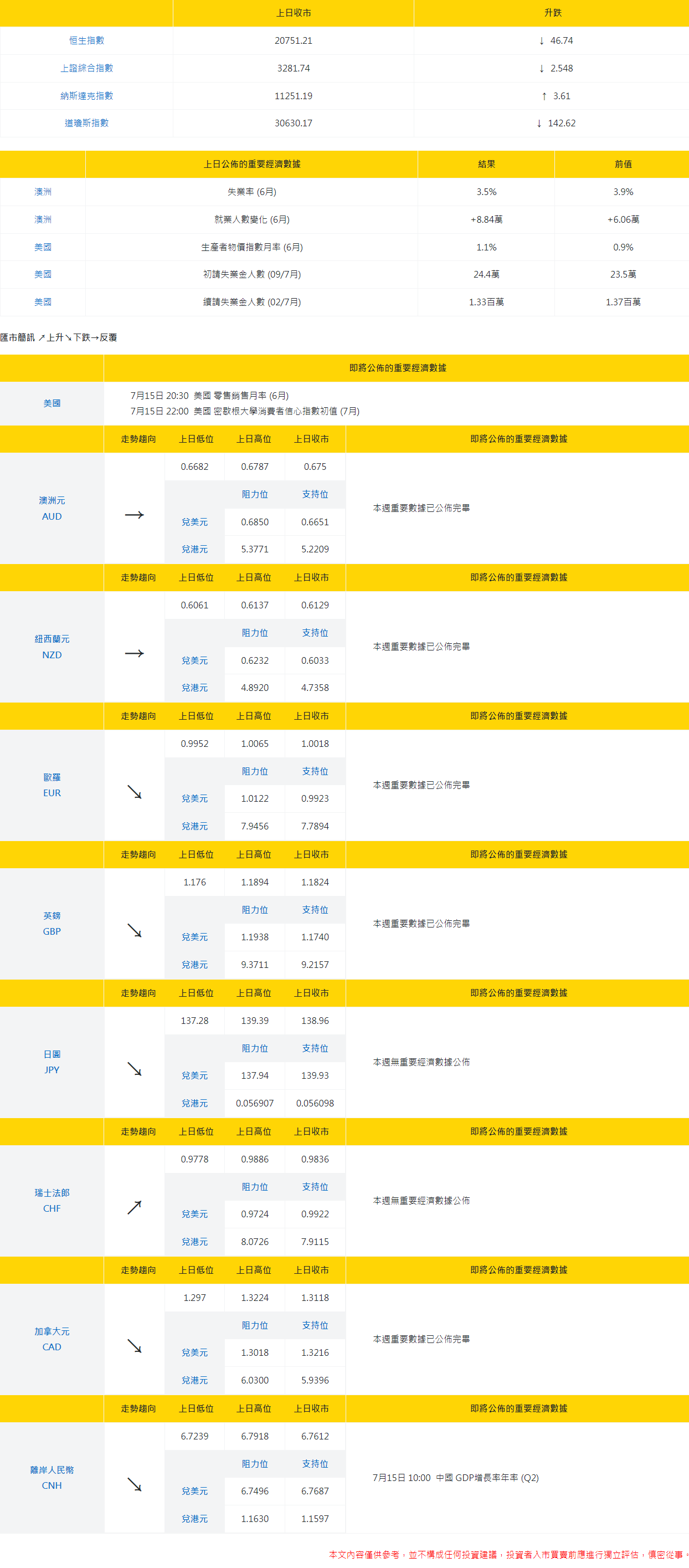 大丰银行:今日外汇走势分析和投资策略(2022年7月15日)