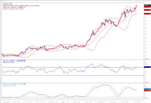 周四(7月14日)欧洲盘阶段,美元兑日元向上触及穿破139,最高触碰到139.38,创下自1998年9月以来的高位。美国CPI\PPI这两项反映通胀数据继续增长爆表,极度提高了本月底美联储加息100个基点的预期,美元也是频创历史阶段高位加以回报。与此同时,日本昨日新增9.4万人感染新冠病毒,逼近历史纪录,首都东京疫情扩散迅速,都进一步狙击着日元。日图在均线支持下继续走高,仍维持看涨势头。4小时图震荡上行,再创新高,多头仍占主导。小时图整体维持上行,短期均线多头排列,仍倾向继续走高。目前美日的节奏是小幅回调,大幅创新高的走势特地。短期注意回避美日调整回落风险,但在大趋向上,美元兑日元走高的势头似乎还未看到逆转之时。