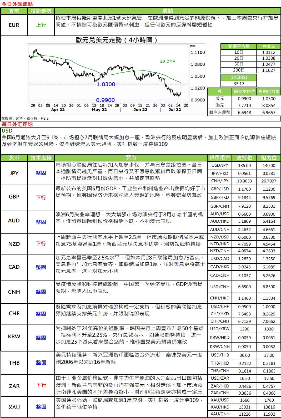 · 本周市场焦点相信离不开欧元区。因为于本周四的议息会上,市场料欧央行将很大机会加息,并首度开启其加息周期。不过,面对疲弱的经济前景,市场料欧央行较大机会仍只轻微加息 25 基点。