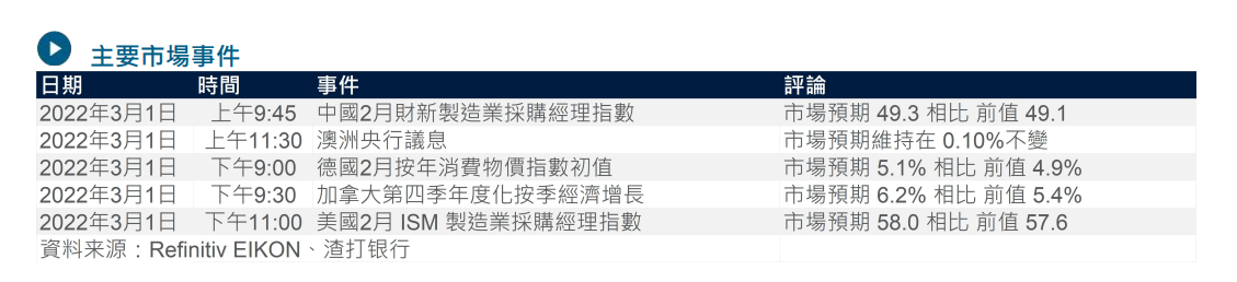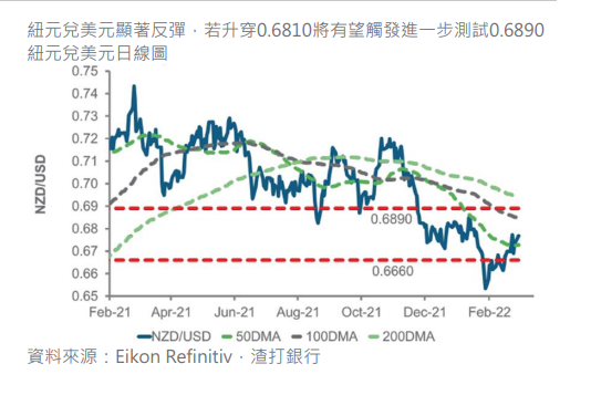 我们预计澳洲储备银行今天会议不会有重大变化,它是自乌克兰被入侵後首间十国集团央行举行货币政策会议。但澳元兑美元在临近0.7285 和 0.7330 之间的阻力区仍然展现动力,若央行意外地取态鹰派可能会触发空仓回补,从而推动测试阻力水平。我们继续看好澳元。