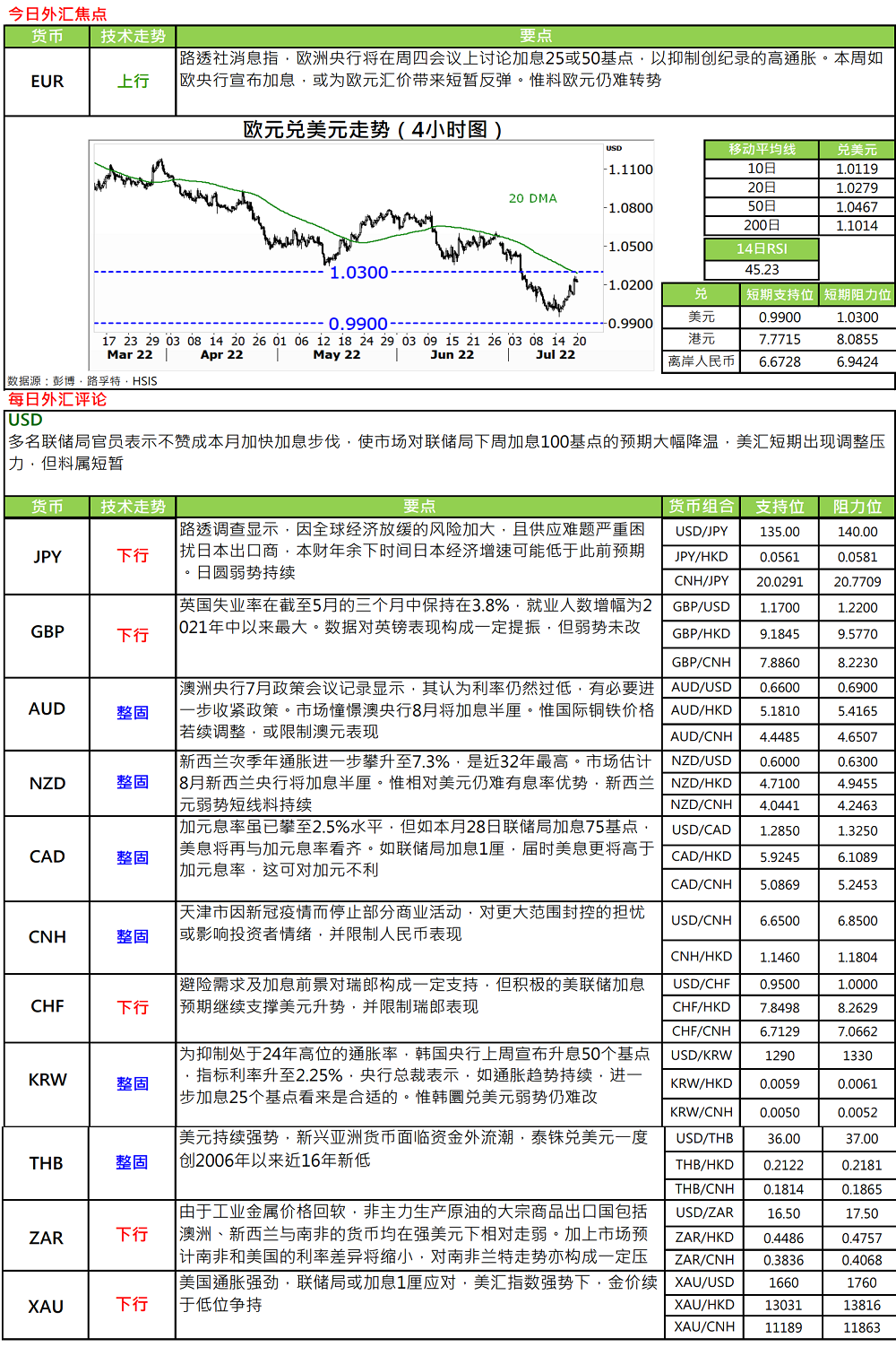 · 路透社引述消息指,在完成维护工作后,俄罗斯将于周四(21 日) 按计划恢复透过「北溪一号」管道向欧洲输送天然气,惟供气量可能低于正常水平。假若俄罗斯如期恢复供气,料有助纾缓市场对欧洲能源供应紧张的担忧,间接利好欧元表现。