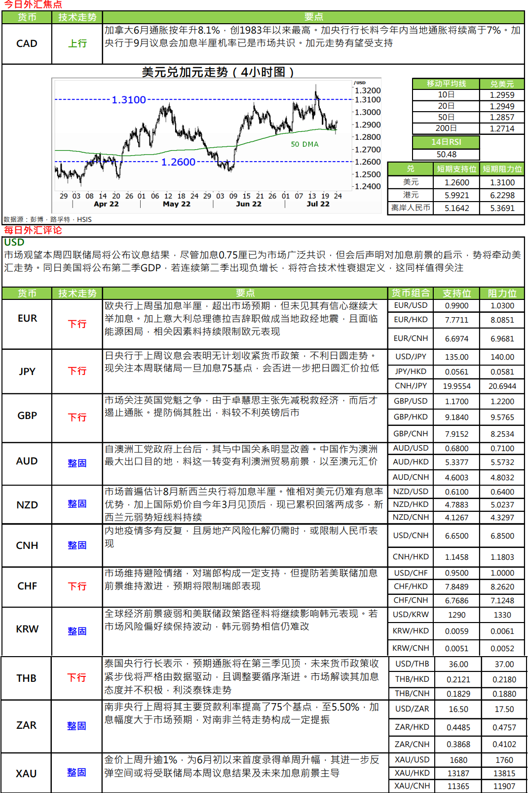 · 其它经济数字方面,本周有两个通胀数字值得关注。周三澳洲将公布第二季通胀数字。市场估澳洲的年通胀率将由第一季的 5.1%大幅攀上 6.2%水平。如属实料将增强澳央行 8 月 2 日议息会加息半厘预期。到周五,欧元区将公布其 7 月通胀数字。这将会是全球主要经济体中的首个 7 月份通胀数字,所以值得关注。回忆欧元区内 6 月年通胀率为 8.6%,其 7 月通胀会否再升,本周五自有分晓。而于同一天,欧元区将公布第二季 GDP,这数字同值得留意。