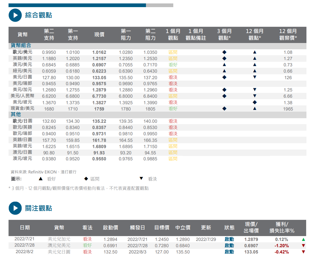 由於美国众议院议长佩洛西访台,引发中国进行军演以表达严厉警告,经济不确定性和美中紧张局势升级导致市场风险情绪下滑,股市收跌、美元指数上升。此外,三位强硬鹰派的美联储官员坚决支持加息,这恐将阻碍经济前景观点。美国 2 年期国债利率升至近一周新高,使得欧元回落至 1.02 之下。初步支持 1.01 恐面临挑战,我们维持区间波动而倾向偏淡的观点。