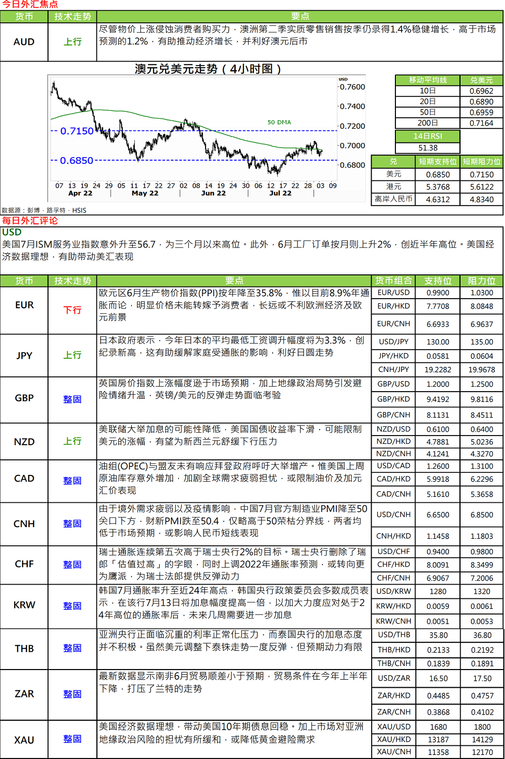 · 欧元区 6 月生产物价指数(PPI) 按年上升 35.8%,较前值微降 0.4 个百分点,为近四个月低位,符合市场预期。主要仍受能源及中间产品价格升势所带动,但价格略见放缓迹象。不过,资本品、耐用消费品及非耐用消费品价格则续见上升。至于不包括能源的核心 PPI 按年则上升 15.6%,较前值回落 0.4 个百分点,数据反映欧洲上游成本仍然居高不下,以目前 8.9%通胀而论,明显价格未能转嫁予消费者,可视为长远蚕食企业盈利的因素,不利欧洲经济及欧元前景。