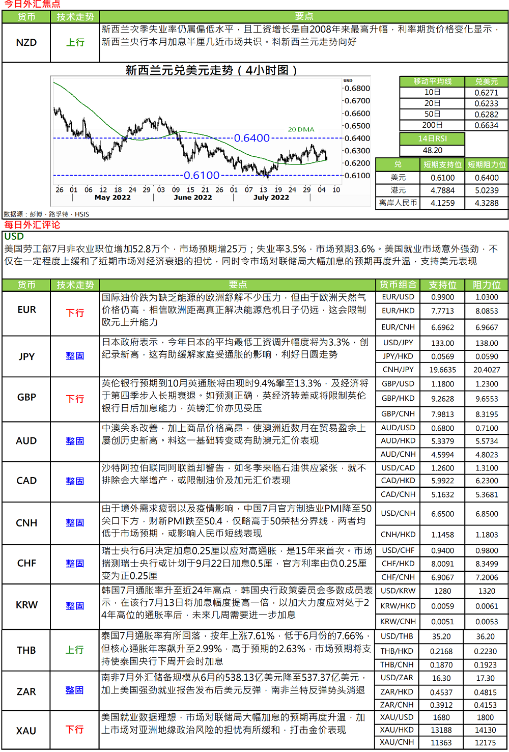 · 美国 7 月非农业职位增加 52.8 万,远高于市场预期的 25 万,前值亦上修至 39.8 万份。同期,失业率微跌 0.1 个百分点至 3.5%,不旦优于市场预期的 3.6%,且从回疫情前水平。主要受强劲的私人市场职位增长带动。至于 7 月平均工薪按月及按年分别增长 0.5%及 5.2%,市场原先预期为0.3%及 5.2%.美国就业报告意外强劲,使市场对美国加息忧虑再度升温,带动美元避险需求。