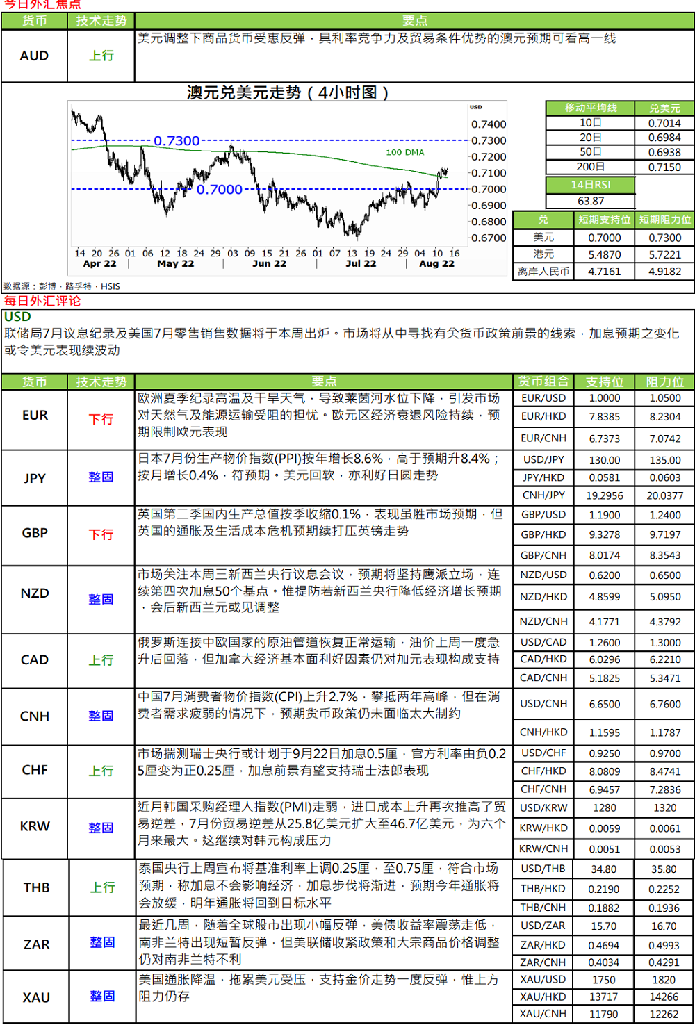 · 本周市场焦点均集中于周三(17 日) 首先,为新西兰央行将举行议息会,由于通胀仍远高于央行 1-3%目标,再加息 50 基点至 3 厘水平已达市场共识。市场关注在高于 2%的中性利率水平之下,央行强硬的政策立场会否转变。此外 ,联储局将于同日公开 7 月份议息纪录,市场期望能从中寻找货币政策线索。不过,由于会后多数委员均已表态,同意未来利率走势将取决于经济数据,可预期议息纪录能给予市场惊喜的机会不大。