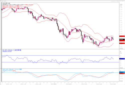 上周五英国国家统计局称,6月国内生产总值(GDP)下降0.6%,是2021年1月以来最大幅萎缩,但仍远好于路透调查分析师预估的下降1.3%。英镑兑美元伦敦早盘重挫0.58%,至1.2143美元,兑美元的跌势比其他货币更猛。在英国下一任首相争夺战中领跑的外交大臣特拉斯日前进一步呼吁评估英国央行的任务授权,并提出了设定一项新的货币供应目标的可能性。对于重新启用货币供应目标的做法,外界担心,特拉斯可能是在暗示,这是放松货币政策、让经济更加火热的一种方式。如果改变授权,大家会看到英债被抛售,英镑也会遭到抛售。日图在前期高点1.2290附近受阻小幅回落,仍偏弱势。4小时图在大阳线后陷入1.2260-1.2180整理,略倾向下行突破。小时图两度测试1.2250附近水平破败回落,空头略占主导。日线图上整体上来说镑美暂时还是处在20日均线上方,且在布林带通道上轨运行,目前还未显现极度的弱势。现在下方1.21的支撑较为关键,若守得住,则还存在继续攀升的机会。
