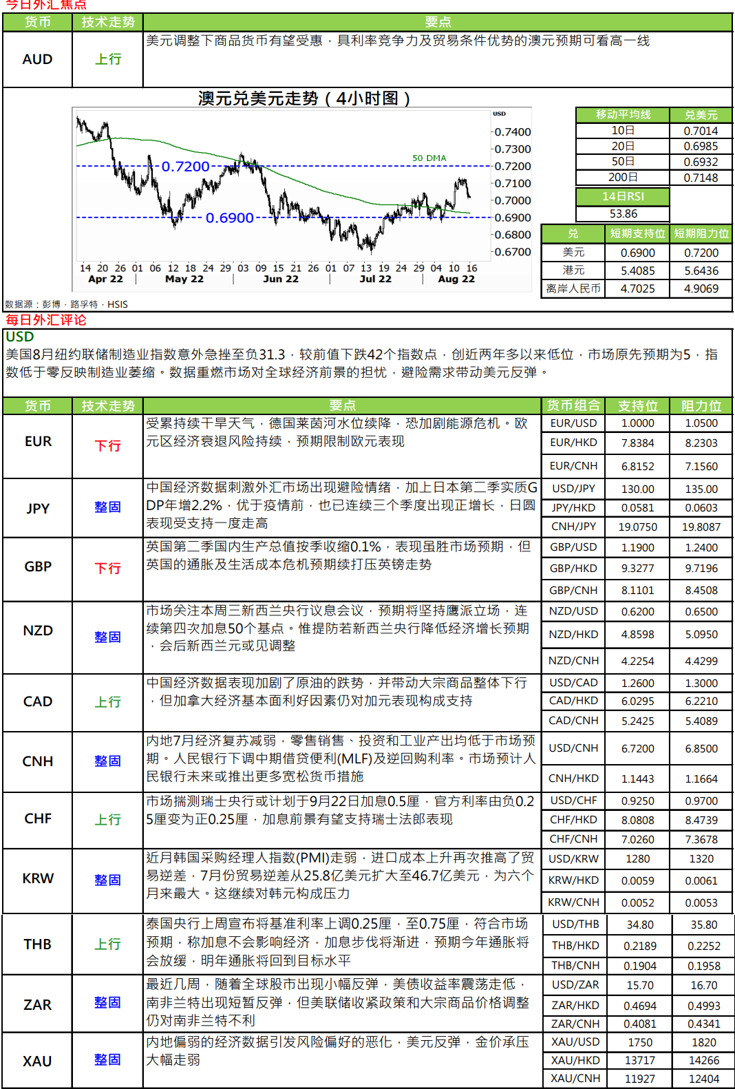 · 国家统计局公布,内地 7 月工业生产按年上升 3.8%.期内,零售销售按年增加 2.7%,两者按年升幅均低于市场预期的分别 4.6%及 5%.数据显示内地多区疫情再起及楼市困局等经济阴霾仍未消退。不过,人行周一意外下调中期借贷便利(MLF) 政策利率,展现中央扶持经济的决心。惟市场忧虑行动或使中、美息差扩大,拖累人民币汇价表现。