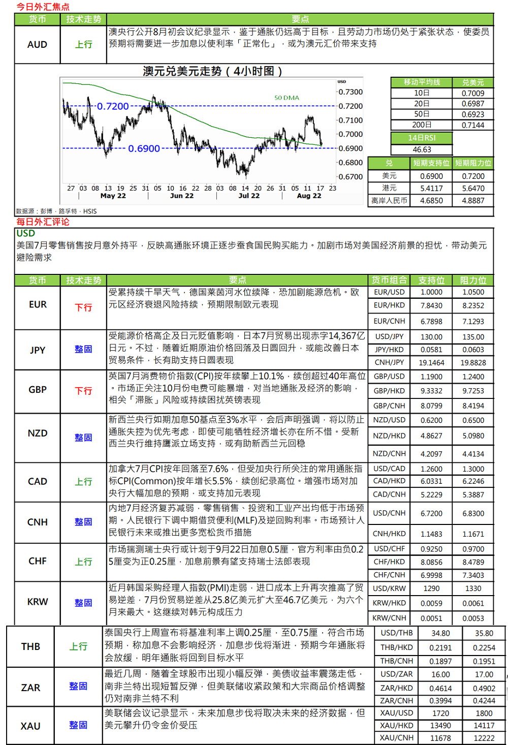 · 新西兰央行于议息会后,一如预期宣布加息 50 基点至 3%水平,创近七年以来高位,且亦是连续第四次作 50 个基点的加息决定。会后声名指,继续收紧货币条件以保持物价稳定,并促进最大化的可持续就业仍然是适当的。且强调央行以防止通胀失控为优先考虑,即使可能牺牲经济增长亦在所不惜。另外,新西兰央行亦上调明年初官方现金利率(OCR) 预测至 4%,较前值增加 0.3 个百分点,预示未来数月或需采取更鹰派的紧缩政策,以抑制居高不下的通胀。受央行维持偏鹰派立场所支持,新西兰元汇价亦见回稳。