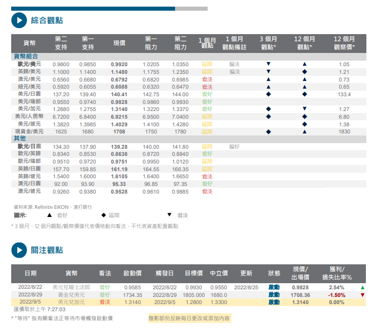 欧元兑美元上周五下跌、连续第四周收市偏软,主要受俄罗斯宣布北溪一号管道将无限期关闭所影响。上周末,德国宣布为消费者提供 650 亿欧元的计划,其他欧洲国家也可能宣布类似刺激措施。尽管预期欧洲央行加息,但能源安全担忧可能推动欧元在未来几天测试 0.9900 和 0.9850的支持价位。监於风险情绪减弱,英镑兑美元亦轻微下跌。今天稍後英国将宣布下一任首相,或能在未来几周内减少政治不确定性。若能守住英国脱欧後低位 1.14 支持,英镑短线或会呈区间整固。市场亦可能关注今晚的石油组织及产油国会议。任何有关减产的声明都可能推高油价,并利好加元。本周加拿大央行有机会加息 75 个基点,亦可能推动美元兑加元逼近自第一季以来的升势下缘水平。因此,我们开启看淡美元兑加元交易观点。