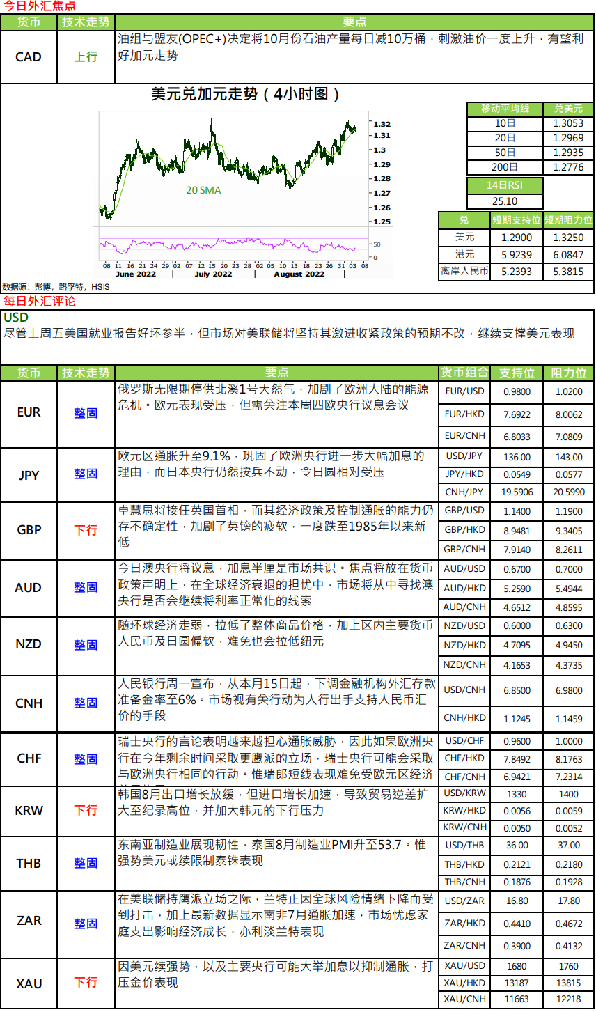 恒生银行:今日外汇黄金市场评论及操作建议(2022年9月6日)