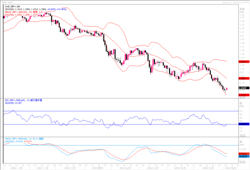 英镑兑美元周一(9月5日)在两年半低点附近徘徊。特拉斯在保守党领导人竞选中获胜,将成为英国下一任首相。特斯拉实施新政的第一步提出减税并正在考虑抵消能源支出上升的支持措施,这些措施可能会进一步增加通胀上行的压力,并扩大预算赤字。对英镑而言,更宽松的财政政策可能会带来短期的提振。然而,已经捉襟见肘的公共财政将更加不稳定,这将可能会让潜在的买家望而却步。日图受下行均线打压不断刷新低点,仍维持弱势。4小时图均自低位产生反弹,目前已穿越了20周期均线,技术指标自超卖区域出现拐头,显示短线有超卖回补的反弹整理趋势,若能进一步反弹穿过1.16,则前方的阻力位置在1.1740附近。