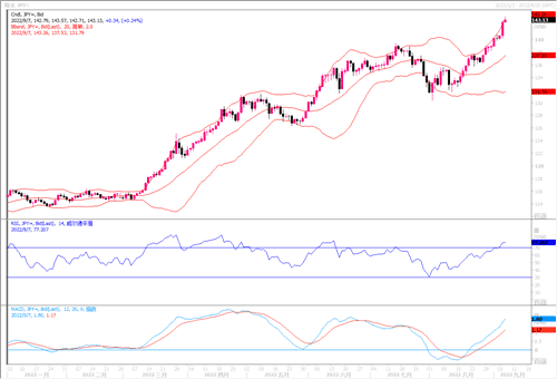 美元兑日元周二升穿142日元的象征性水平,盘中最高触及143.59,创下24年新高。主体原因是欧洲和美国的杠杆基金重新押注日本央行将继续实施超宽松的货币政策,同时昨日澳联储继续加息0.5百分点后,触发日元的加速下跌。日本央行顽地奉行宽松的货币政策,进一步拉大了与各主要发达经济体息差,从而也就加大了做空日元的吸引力。4小时图整体上行势头维持完好,短线在140.60获得支撑,回调力度有限。日线图,各项技术指标良好的强势向上发散,显示美元兑日元多头欲望强烈。近阶段美日恐怕走的是小回大涨的节奏。在美日大涨之际,需要警惕防范来自日本央行方面的干预举动风险。