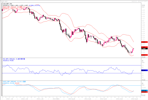 周一(9月12日),由于美元偏软,英镑兑美元获得进一步的喘息机会而出现了连续第二个交易日的反弹,英镑兑美元反弹1%至1.1705美元--为近两周高点,并脱离上周触及的37年低点1.1407美元。周一的数据强调,英国经济正显示出价格飙升带来的紧张迹象。英国7月份国内生产总值比上月增长0.2%,而经济学家的预期是增长0.4%。到底该怎么解读英国的经济状况,还需注意明天的8月就业数据,以了解英国劳动力市场到底有多紧张。目前,市场预计英国央行在9月22日决定政策利率时将再次加息50个基点。从技术图形上观察,英镑兑美元各级别图上都处在极端超卖的空头回补修正状态中,技术指标略产生超卖拐头迹象。上方若能突破1.17,上行初步目标1.18-1.1850的价格区域。下方的支撑依次为1.1650、1.1560。