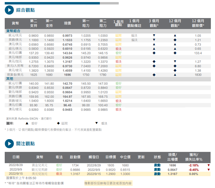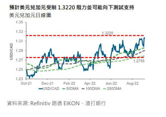 美国 PPI 数据低於预期,市场对加息预期略有回落,美元指数亦见回落。日本央行将对银行进行利率检查,市场估计该行或准备在日圆再大幅走低时作出干预,利淡美元兑日圆下跌。然而,日本央行实际买入日圆以进行干预的可能性仍低,而利率检查的时机显示 145 是值得关注的关键价位。美元兑日圆的支持料在 139.40.在英国通胀数据低於预期後,英镑兑美元上升。英镑仍面临主要阻力,即经济增长放缓和利差等因素,因此我们认为投资者可能倾向淡化此轮升势。预测汇价支持在於 1.1400,若跌破的话英镑可能会大幅下跌并测试 1.10 水平。美元兑加元开市相对持稳,因为加拿大工厂销售在 7 月份连续第三个月下降,但国际能源署(IEA)预期从天然气转往石油的需求增加,使油价上升并抵消前述利淡加元的因素。我们维持看淡美元兑加元的观点,预计汇价将测试 1.3075 支持。因此,我们开启了看淡美元兑加元的观点。