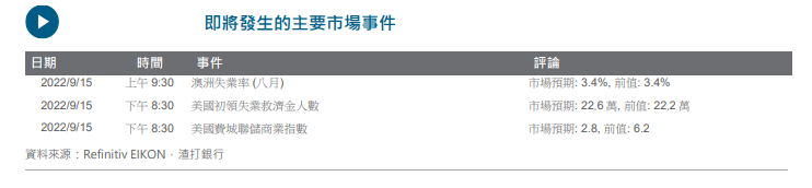 对政策敏感的美国 2 年期国债利率进一步上升 3 个基点至3.79%,继续处於 2007 年 11 月以来最高。虽然联邦基金 h利率期货显示明年初政策利率或达到 4.3%,但 7 月份 PCE通胀报 4.6%和第二季 GDP 下降 0.6%(两者均低於 FOMC於 6 月时的预测),有关数据恐难以支持下周加息 100 个基点。与此同时,美国 8 月份 PPI 低於预期(8.8%),连续第二个月下降至 8.7%(7 月份为 9.8%)。核心 PPI(扣除食品和能源)继续偏强,从 7 月份经上调按月增长 0.3%上升至按月升 0.4%.另外,英国 8 月份 CPI 报 9.9%(预期10.2%),是 9 月 21 日以来该数据首度放缓,主要受到能源价格下跌影响。然而,8 月份核心 CPI 从 6.2%升至6.3%,推升了英伦银行下周大幅加息 75 个基点的可能性。