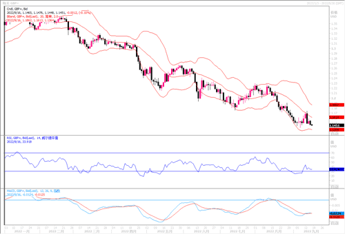 新任首相特拉斯计划通过扩大借款为庞大的能源援助计划提供资金,这加剧了投资者对英国经济长期前景的担忧。目前有很多关于滞胀的讨论,而现在拥有滞胀的地方就是英国经济,这是英磅今年表现如此糟糕的一个重要原因。日线图上来看,英镑再次有向本月初曾到过的低点1.1406逼近的势头。但技术指标方面,macd指标快慢线有金叉形成迹象,若在1.1406低位经整理后能够撑住,或许能获得一定的反弹上修的动能。但上述支撑低位一旦跌穿,恐在触发技术性卖盘的刺激下,加速向更深渊处滑去。
