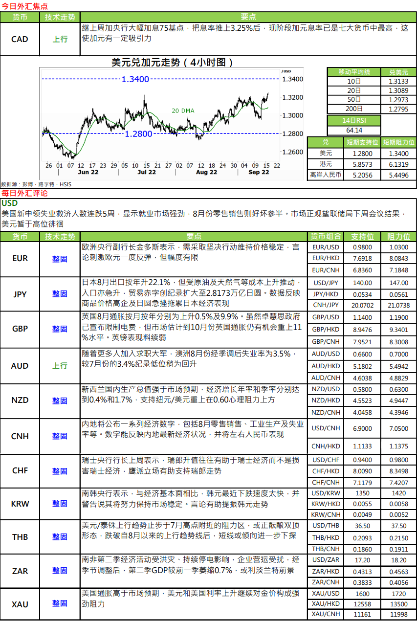 恒生银行:今日外汇黄金市场评论及操作建议(2022年9月16日)