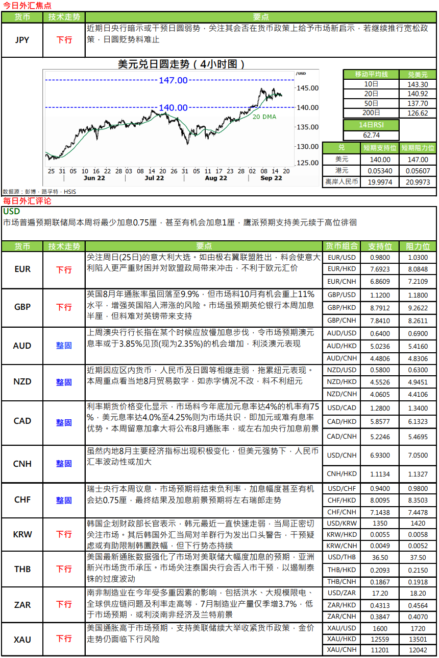 恒生银行:今日外汇黄金市场评论及操作建议(2022年9月19日)