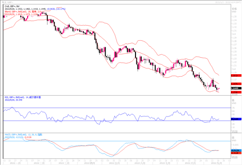 周一(9月19日)英镑兑美元在欧洲盘早段曾继续下挫报1.1381美元,和上周五触及的37年低点1.1351美元相去不远,纽约尾盘阶段有所回升,收盘于1.1435。英国央行将在周四举行会议,英国新财政大臣夸滕(Kwasi Kwarteng)料于周四或周五公布他上任的首份财政报告,预计将有关于能源价格上限和减税的进一步细节。虽然英国央行本周料将至少加息50个基点,但进一步收紧的前景未能支撑英镑。因为,美联储本周也将召开会议,对至少75个基点的更大规模加息的预期支撑着美元,其注意力盖过了对英国央行的关注度。然而,若本周三美联储果如市场预料般加息75个基点,还是要注意:利空消息释放之下,英镑转而有反弹修正的机会产生。日图进一步扩大跌幅但仍收于1.1400上方,尽管整体偏弱但需要有效跌破该档才能打开进一步下行空间。4小时图短暂刺穿1.1400后很快企稳,但仍受下行的均线压制。整体英镑弱势格局没变,但须防范短线反弹调整的风险。