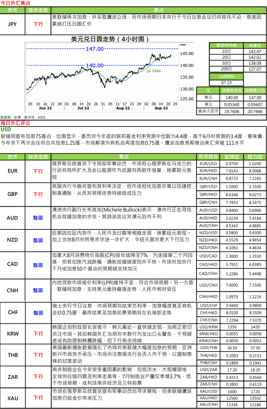 恒生银行:今日外汇黄金市场评论及操作建议(2022年9月22日)