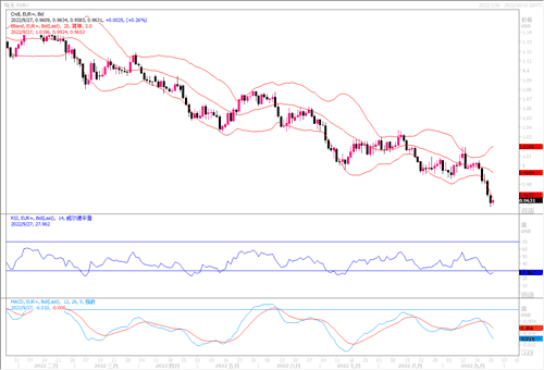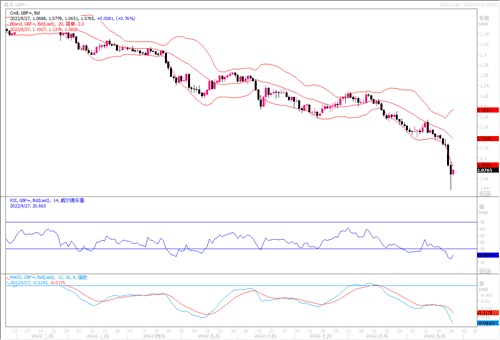 周一(9月26日)美元兑一篮子货币=USD上涨0.804%,报114.05,稍早触及2002年5月以来最高114.58。欧元兑美元也触及0.9528美元的20年新低,尾盘下跌0.81%。在经济方面,欧元区9月份制造业PMI初值为48.5%,服务业PMI初值为48.9%,综合PMI初值为48.2%,均明显低于50%临界水平,欧元区经济显现衰退迹象。而且随着欧洲能源危机发酵,欧元兑美元的弱势仍难以得到缓解。技术层面上,日图跌破0.9800一线加速下行,整体仍看跌。4小时图短期均线系统空头排列,下行动能猛烈但在20年来低位0.9550得到一定的空头回补盘推动暂时获得反弹喘息的机会。日线级别图上布林带喇叭口扩张,欧元的跌势明显,上方初步阻力在0.9700,继而是0.9833。下方关键支撑在隔夜低点0.9553,若跌穿历史的低位纪录恐会继续创出。近期预料该货币对将会进入区域震荡整理走势,区间主要在0.95-0.98之间。