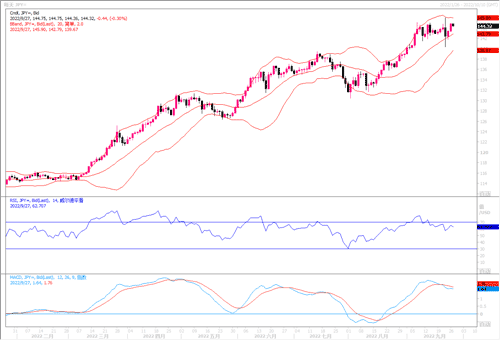 美元兑日元周一(9月26日)上涨0.84%至144.585。上周四触及的24年峰值145.90,但当天在日本20多年来首次买入日元进行干预后,美元下挫至140.31左右。根据东京外汇市场经纪公司的估计,日本在那次卖出美元、买入日圆的干预中估计花费了约250亿美元。然而在欧美不断紧缩货币政策的背景下,只要日本央行继续维持现有宽松货币政策不变,日元的贬值趋势就难以扭转。而日本央行的大举干预效果也将是短暂的。日图仍在高位震荡,短期均线走平,仍有望在145下方受阻,下方支持143。4小时图大阴线连续小阳线修正,但上行显得谨慎,下方支持关注143.40一线。小时图持续反弹,但多空纠结,随机指标在144上方有回落信号。上方的强大阻力在145.00水平附近。料美元多头会继续尝试突破该水平,若日本央行无干预行动出现,则美日将继续向更高蜂试着挺进。