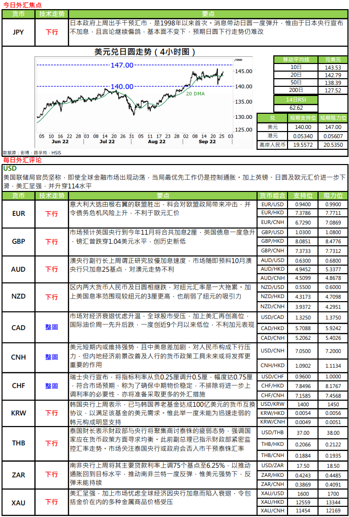 恒生银行:今日外汇黄金市场评论及操作建议(2022年9月27日)