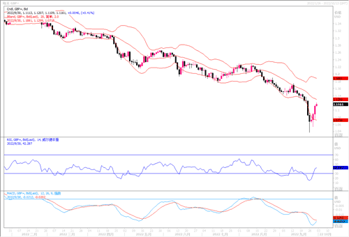 英镑在周四的震荡交易中大幅上涨,从周一创下的纪录低点回升,此前英国央行连续第二天购买英债以稳定金融市场。英镑创下了自2020年3月以来的最大单日百分比涨幅。在报道称英国首相特拉斯周五将同英国预算责任办公室(OBR)负责人紧急会晤后,英镑扩大涨幅,纽约尾盘报1.1084美元,大涨1.8%。在三天前触及1.0327美元的历史低点后,英镑兑美元已经回升了7%以上。英镑回升部分因为英国央行采取的行动。周四,英国央行购买了14.15亿英镑(15.5亿美元)期限超过20年的英国公债,这项旨在稳定市场的数百亿英镑的计划已经实施了两天。有份指出,英国央行的举措所带来的英镑上涨是不可持续的。任何时候央行在进行临时干预计划时,市场肯定会对此进行测试,看看央行是否会继续这样做。一旦央行停手,经济基础面将继续主宰着货币汇率的走势。日图继续显示英镑处于反弹修正之中,但仍受压于20日均线之下,布林带中轨1.13附近构成强阻力位。4小时图中的各类技术指标极度上扬,呈现反弹欲求较为旺盛。日内留意上方1.1220-1.1300区域的阻力情况,若突破,则英镑兑美元有望进一步上攻。若受阻则会回踩寻求震荡整理的区间。