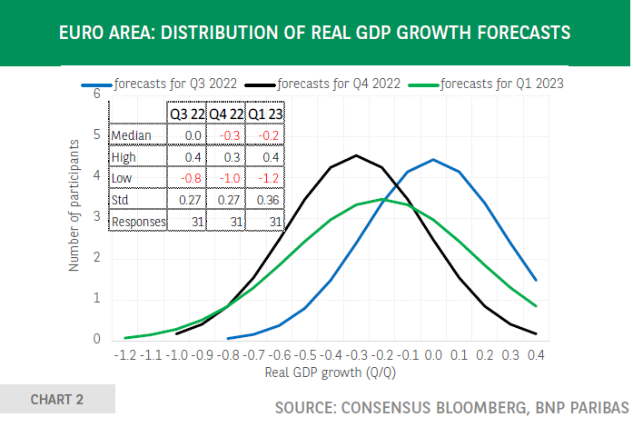 几个月来,在有关经济形势的公开辩论中,通货膨胀一直是主要主题,但可以预料,这种情况不会持续下去。 调查显示,全球供应炼和投入价格的压力有所缓解,几种大宗商品价格最近有所下降,而且,尽管美国的工资增长依然强劲,欧元区的工资增长应该会进一步加快,但激进的货币紧缩应该是逐步抑制通胀的一个关键驱动因素。 与此同时,人们对经济衰退的担忧也在增加,最终,这种担忧将超过通胀,成为经济讨论的关键话题。 美联储主席鲍威尔承认,控制通货膨胀会带来一些痛苦。 根据世界大型企业联合会(Conference Board)最近的一项调查,81%的美国首席执行官正在为未来12到18个月的衰退做准备。 他们预计,这场危机将是短暂、浅显的,对全球的溢出效应有限。 12%的人更加悲观,预计经济将出现深度衰退,并产生实质性的全球溢出效应,而只有7%的人认为不会出现衰退。 尽管费城联邦储备委员会(Federal Reserve of Philadelphia)开展的职业预测者调查(Survey of Professional forecasting)仍预计,在整个预测期限(截止2023年第三季度)内,美国经济将实现正季度增长,但增长预期已被下调。 然而,评估经济衰退的可能性短期上已经显著增加,而中期来看可能性处于纪录高位运行(四个或五个季度,它对应于第二季度和第三季度2023)(图1)。 在欧元区,彭博共识预计今年最后一个季度的负增长,明年第一季度(表2)。 欧洲央行首席经济学家菲利普·莱恩最近在谈论加息时表示,“我们不会假装这是痛苦的自由”,他补充说,不能排除出现技术性衰退的可能性。