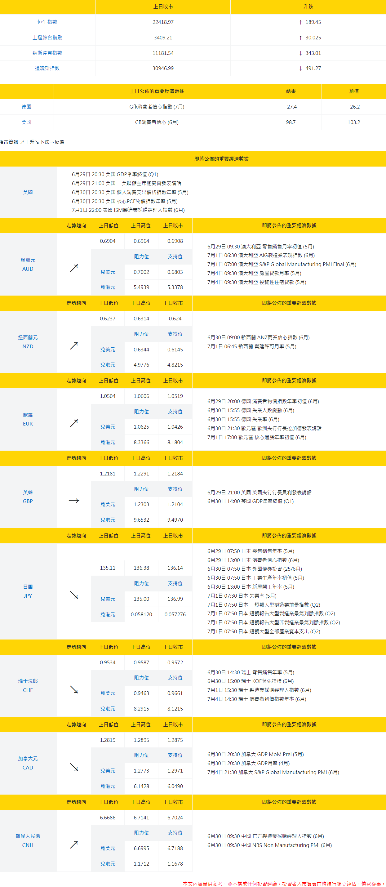 大丰银行:今日外汇走势分析和投资策略(2022年6月29日) 上日市場概況