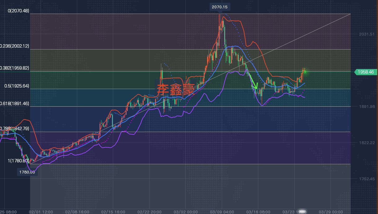 从目前走势来看,我认为反弹并未到位,目前的反弹还没达到这轮跌幅的0.382分割线位置,也就是1961附近。上方关键的压制就在1960-1970前期高点位置,目前已经突破此位置,则进一步看好测试0.382分割线压制。昨日黄金上行突破的短线的下行趋势线压制,那么今日重点看回踩测试趋势线支撑能否撑住,若能撑住则看好上行突破1960高点至1968位置。小时线下行趋势线突破后形成的支撑位在1935附近,同时四小时20日和10日均线在1936附近形成交叉支撑。所以晚间下方关键支撑在1935位置。操作上李鑫豪建议低多看涨为主,反弹高空为辅。