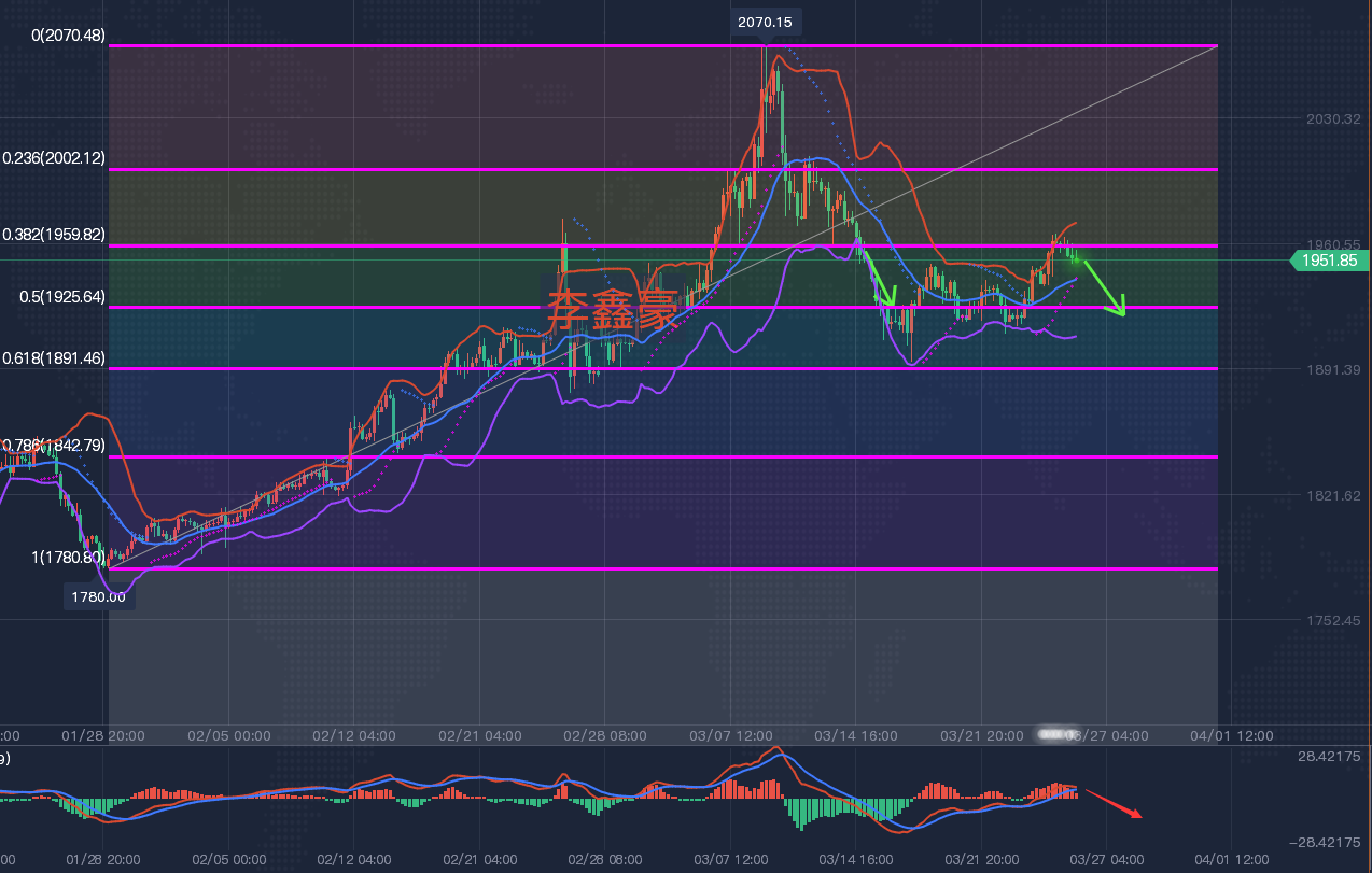 尽管昨日破高点,但是仍然未能突破站上0.382分割线的压制,同时四小时连续小墓碑线,上冲明显受阻,所以今日行情围绕分割线压制先空,回落到位之后再去考虑做多。上方关键压制在0.382位置,大概点位在1961附近,分水岭在昨日美盘1966的高点位置,所以今日行情在1961附近或上方先空,破昨日高点离场。下方短线支撑在1942位置,关键分水岭支撑在1937昨日起涨点位置。
