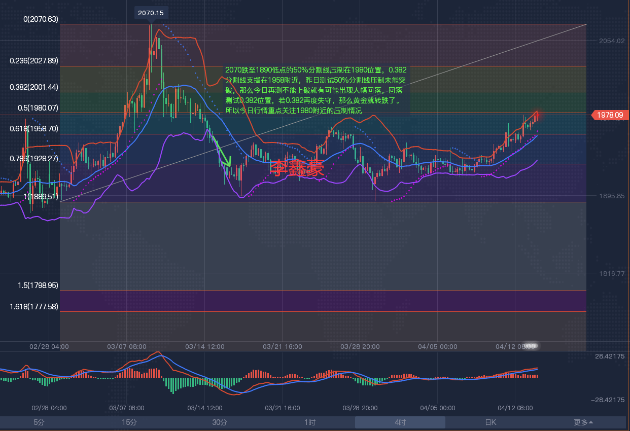 日线已经连阳了,但是每次都冲高回落了,收出长上影线,由此判断,行情可能会出现回落,切记不要追高。我们先来看看黄金分割线,2070跌至1890低点的50%分割线压制在1980位置,0.382分割线支撑在1958附近,昨日测试50%分割线压制未能突破,那么今日再测不能上破就有可能出现大幅回落,回落测试0.382位置,若0.382再度失守,那么黄金就转跌了。所以今日行情重点关注1980附近的压制情况,在此附近徘徊,始终不破可以直接做空看回落。若回落不破0.382位置,也就是1958附近,那么就是震荡,跌破则会继续回落。