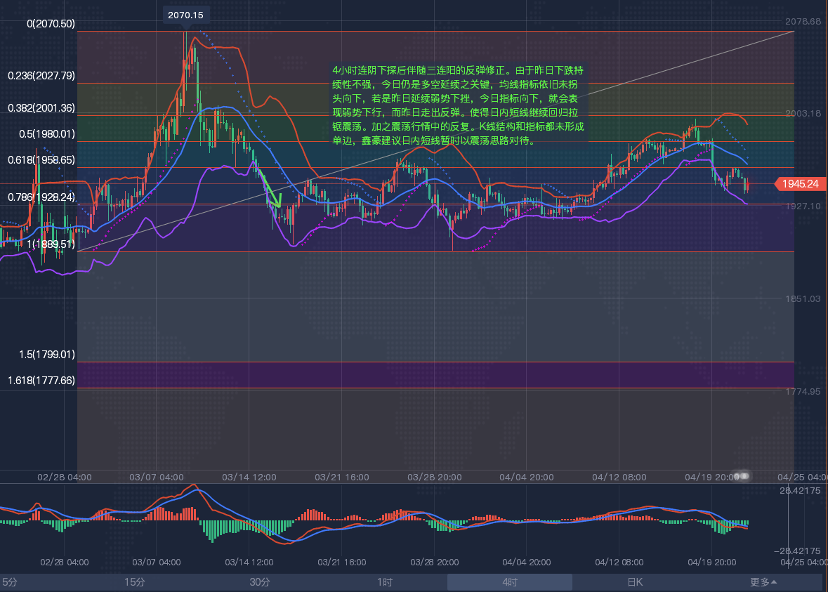 上个交易日,金价在1938附近反弹,日线报收一根略带影线的小阳线,大阴下破后,金价没有选择延续阴线下行,从侧面体现了行情还没有完全脱离震荡的局面,昨天为什么在1938能够受支撑反弹呢?其原因在于这个位置是之前在1915横盘震荡多日实体突破的平台阻力,重新回来,便具备一定的支撑现象,但是昨天的阳线还不能称之为行情要继续延续上行的表现,孔.明昨天对日线进行了宽幅震荡后的两种预期,一个三角形整理形态,一个是大的下行通道,这个思路不会因为昨天的一根小阳线而发生改变,对于日线而言,只有行情能够重新站上2010,才能延续上行看前高压制,在没有出现这种情况之前,日线的宽幅震荡需要一定的时间。