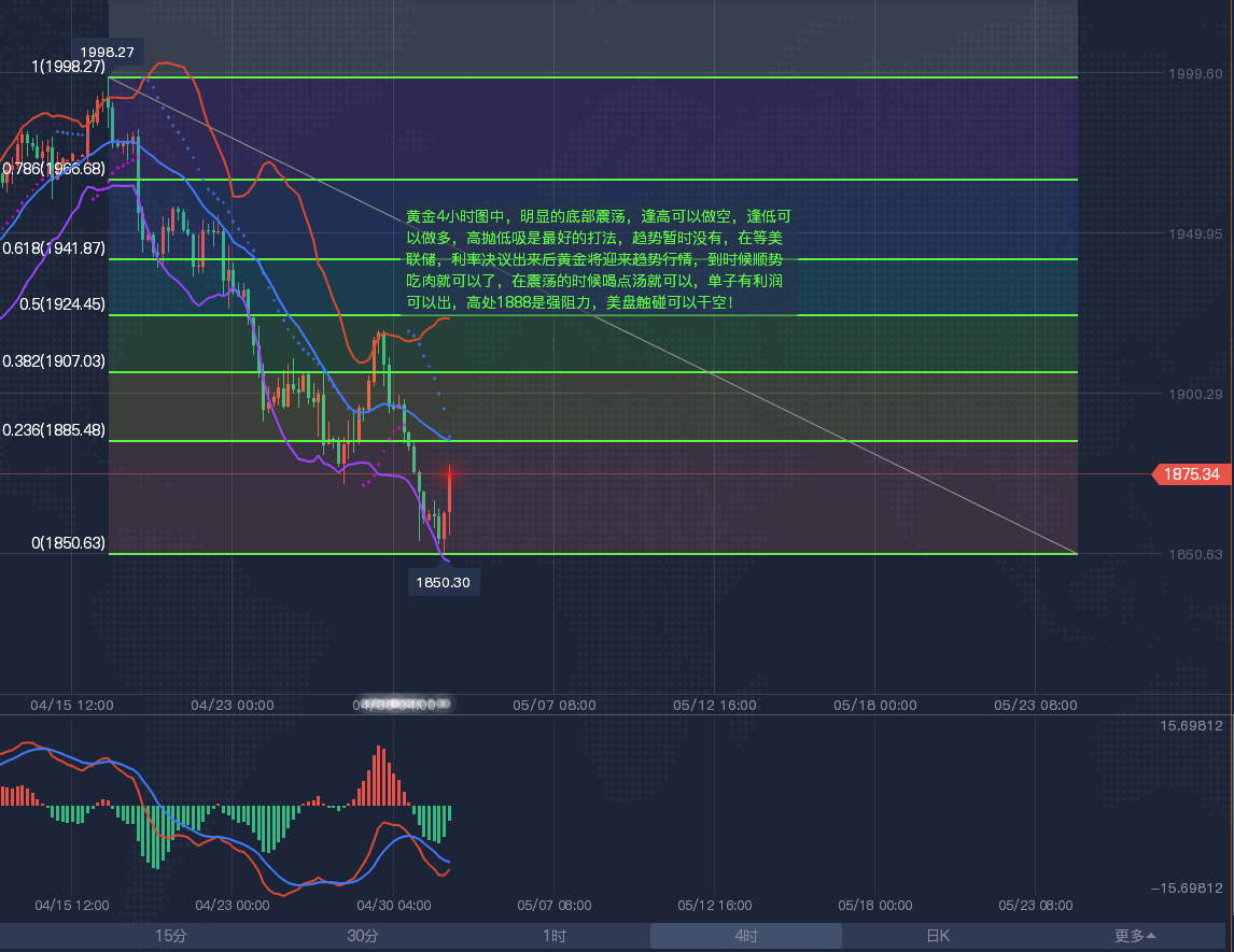 【黄金分析-美黄金】 今日整体波幅不大,李老师带大家在1858做多,涨幅不大,利润有限,有行情仓位翻翻,没行情苍蝇小也是肉,做交易就是这样,不放过任何的机会,也不会硬着头皮冲,灵活应变才能如鱼得水,不能逆水行舟! 黄金4小时图中,明显的底部震荡,逢高可以做空,逢低可以做多,高抛低吸是最好的