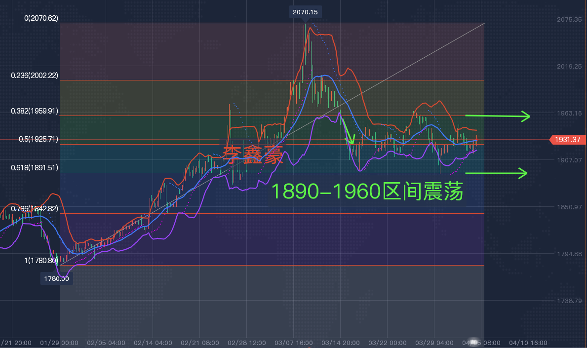 4月5日:上交易日周一(4月4日):国际黄金伦敦金震荡收涨,虽维持在中轨及30日均线下方盘整,但附图指标的空头信号也才不断缩减,同时主图上,100-200日均线支撑在不断推高,金叉也完好保持,暗示后市偏向反弹上行。但仍需注意周线级别的阻力回落。 具体走势上,金价(1935.131.130.06%)自亚市开于1924.46美元/盎司,