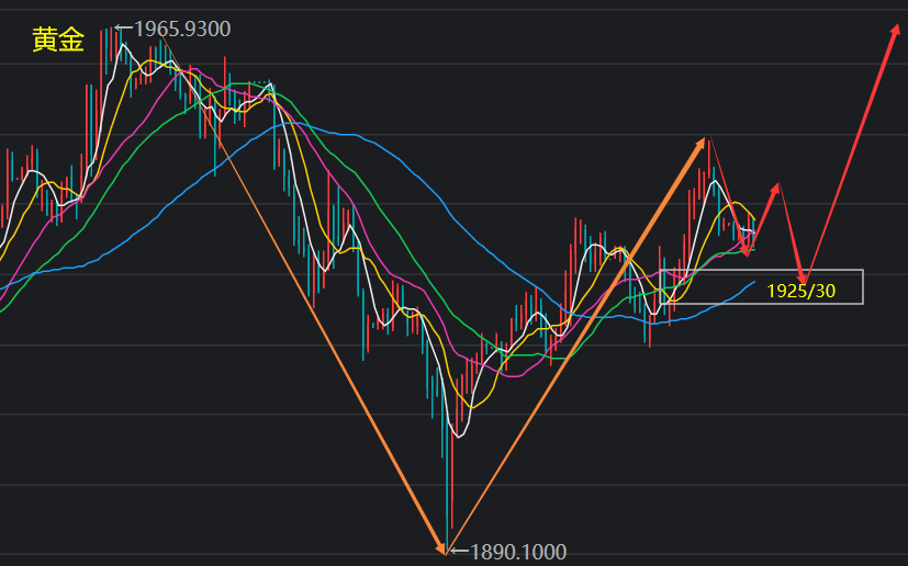 【黄金分析-美黄金】 黄金从技术面来看,日线级别震荡;均线交织,ACD死叉,KDJ轻微金叉,短线走势缺乏明确方向,留意1890-1966区域突破情况。鉴于周一中阴线利空影响仍在,21日均线对金价形成压制,在顶破21日均线1952.82前,后市偏向震荡下行,初步支撑在周四低点1918.90附近,3月22日低点支撑在1910.60附近,
