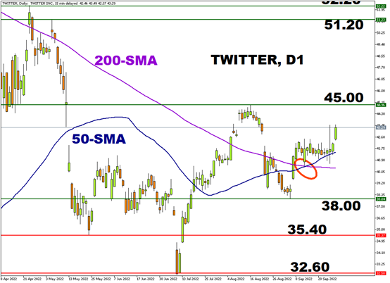 推特股价早前自收购价52水平大幅下跌,最低至32.60水平见支持反弹,8月中旬一度反弹至45水平遇阻回落,目前在38-45区间内横行盘整。