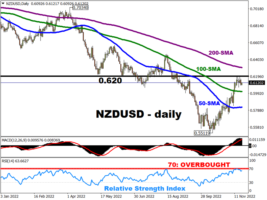 纽元/美元遇阻0.6400,原因是美元试图整理大幅下跌趋势。发稿时,纽元/美元下跌愈1%,从105.896的高点跌至104.664的低点。 推动美元走势的是美联储主席鲍威尔发表鸽派讲话,或者至少是市场更愿意倾听这样的言论。美联储主席鲍威尔周三发表讲话,暗示美联储将在12月政策会议上放缓有史以来的最高加息速度。 鲍威尔在布
