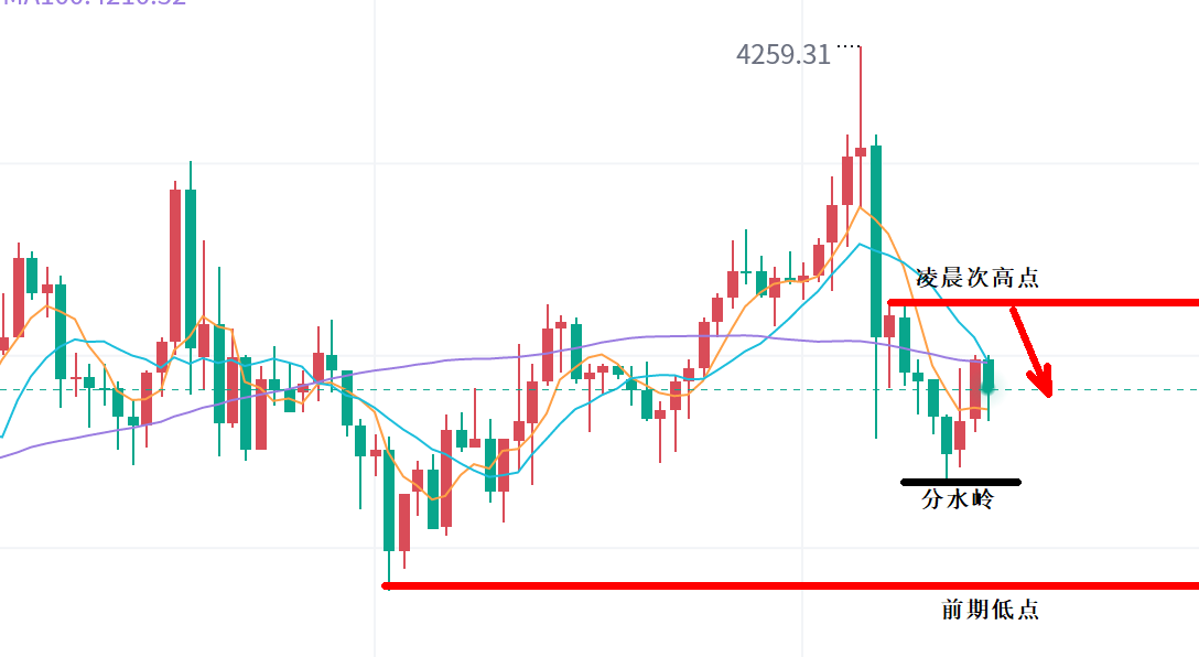 4,再来看破低后,小时线最后一根大阴线顶部在4197.5,你看看凌晨反抽的高点和早间的高点是多少?