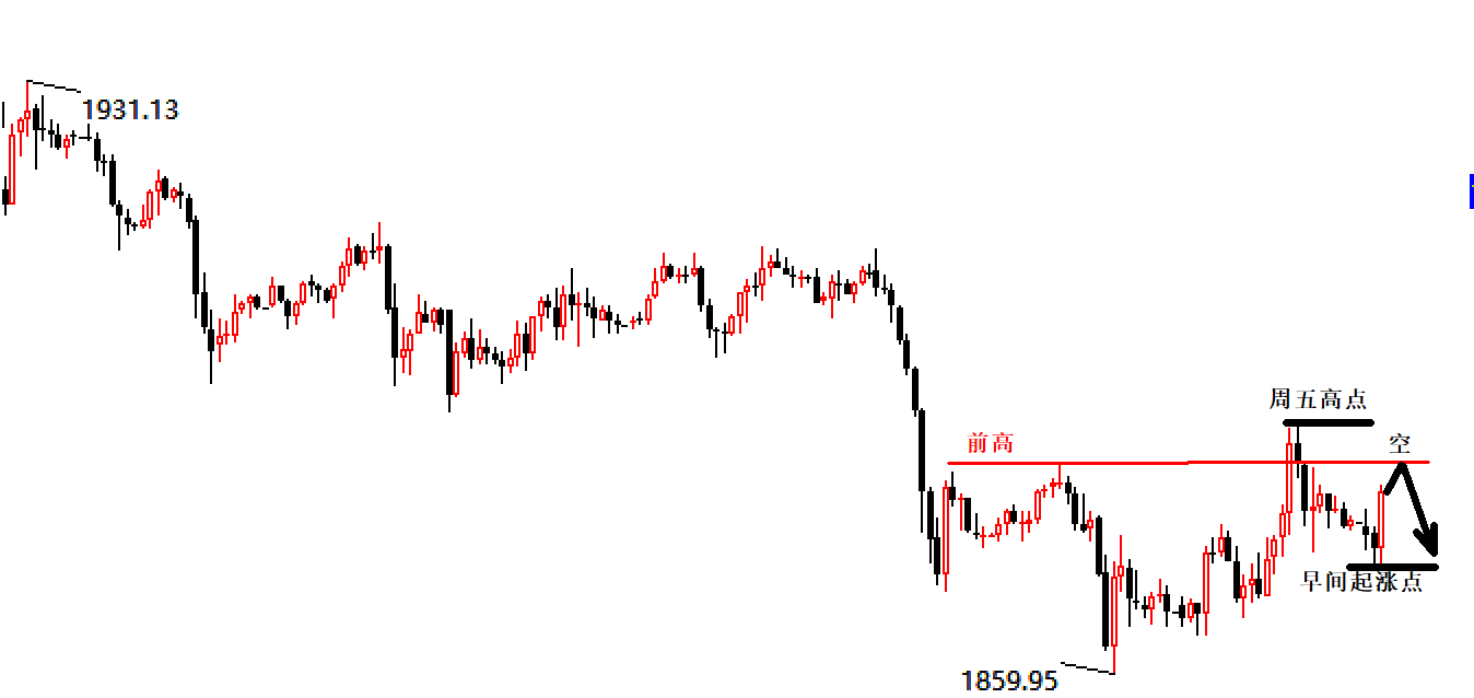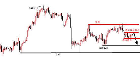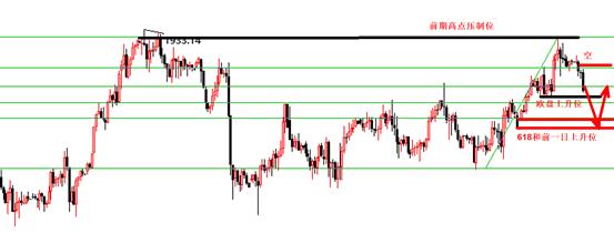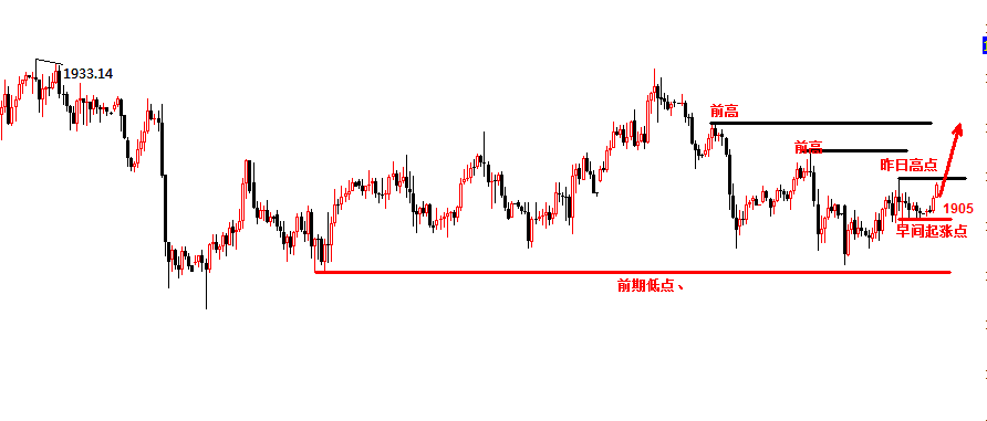 今日日内尴尬了,不仅是周五凌晨高点1904没有遇阻,同时欧盘还没有回撤,形成连续上升格局,价格再次到前期高点1913一线,形成三次测试。 首先,前一日下跌的格局,如果看续跌,要具备两个条件: 一个是不能破高。 另外一个是欧盘要下跌破低,才有续跌。 而一旦当欧盘反弹,且呈现连续上升格局时,就意味着
