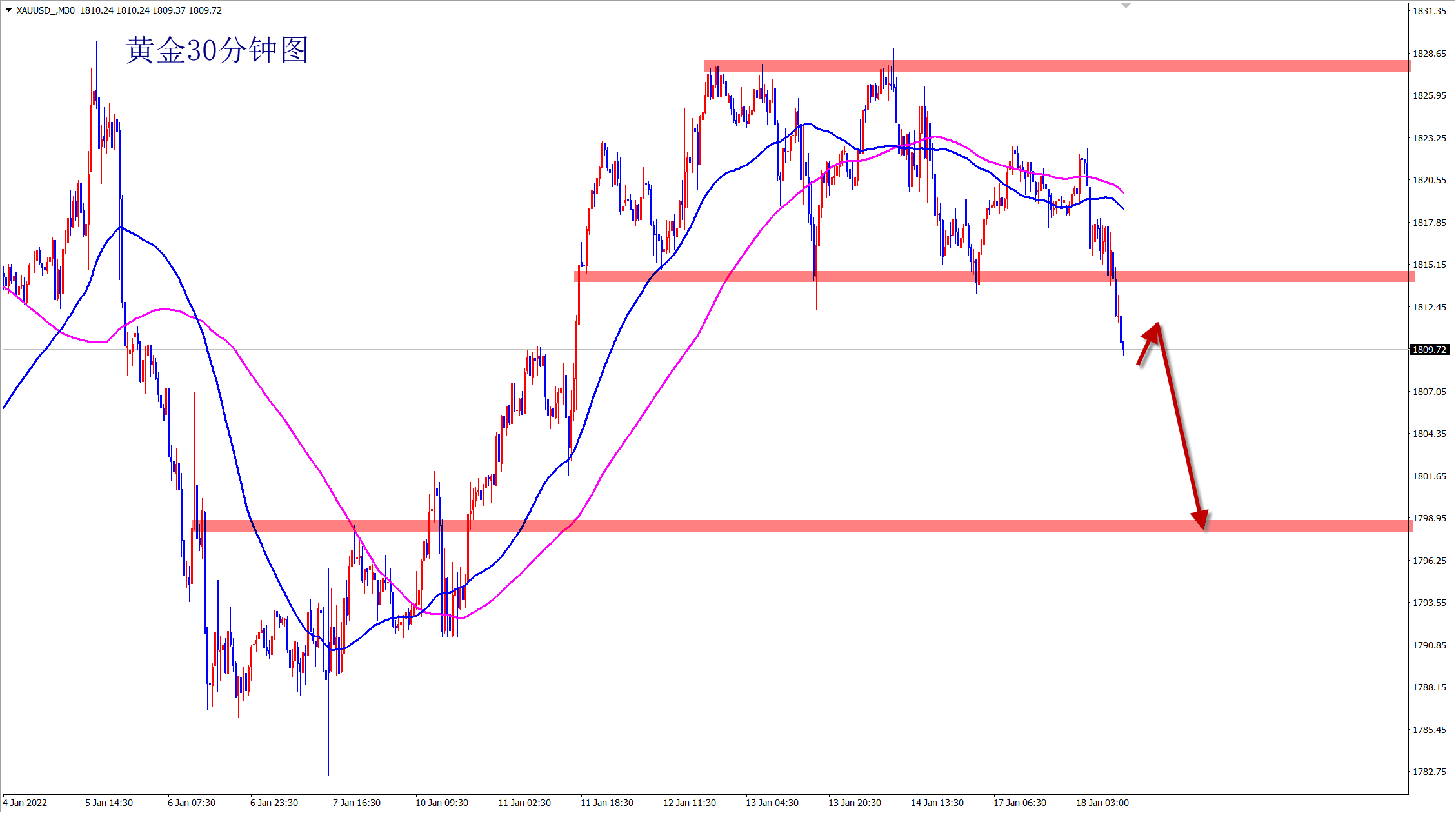黄金欧盘前维持高位盘整,但是欧盘开始后直线下跌,并且破位1813的支撑,我们早盘1820的空单,欧盘1816的空全部大跌拿下利润!当前跌势继续,而且是破位盘整区后的下跌,横有多长,竖有多高!接下来就是暴跌!
