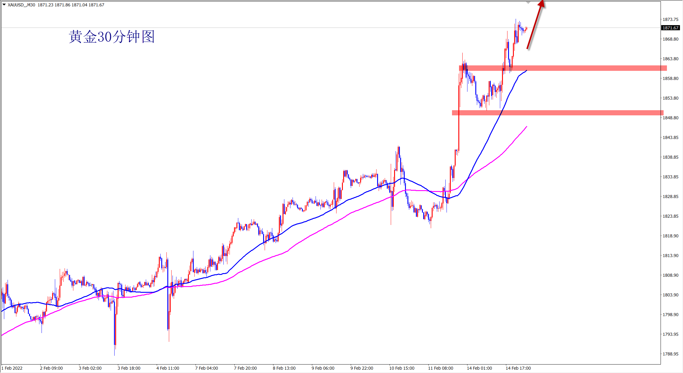 黄金当前明显的上涨趋势,亚欧盘行情多是震荡或者调整为主,但是方向是涨,回落还是干多的机会!今日将依托昨日上涨新高后回踩的1860的支撑继续干多看涨,我们所说的1870位置已经达到,接下来将会继续上行,目标1900-1910区域!