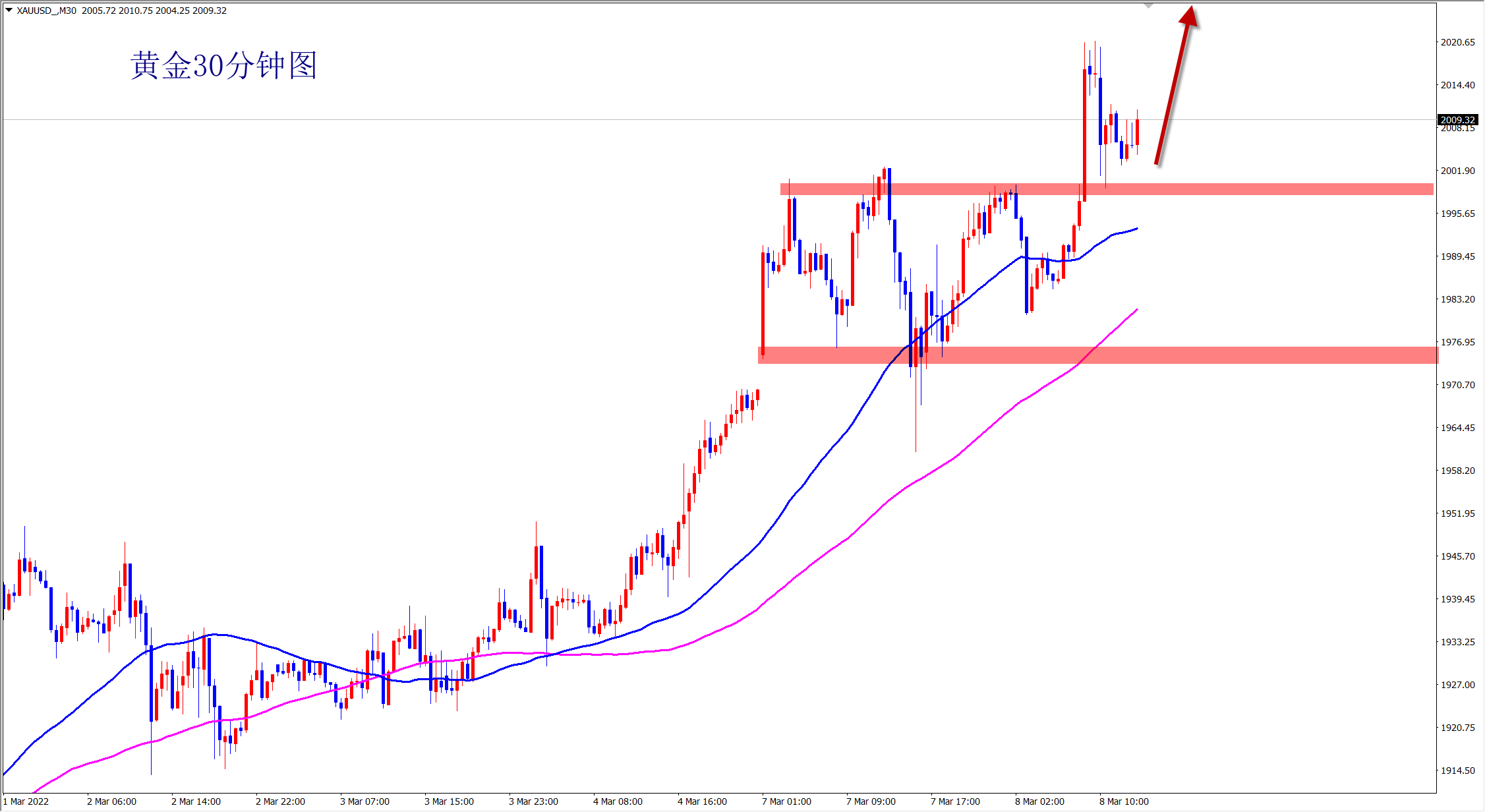 空头不死,多头不止!黄金当前明显的多头走势,而突破2000后最近的阻力位置就是前期历史高点2074位置,黄金将继续上行!俄乌局势没有缓和,避险情绪越演越烈,多,美盘2000支撑位置继续干多!