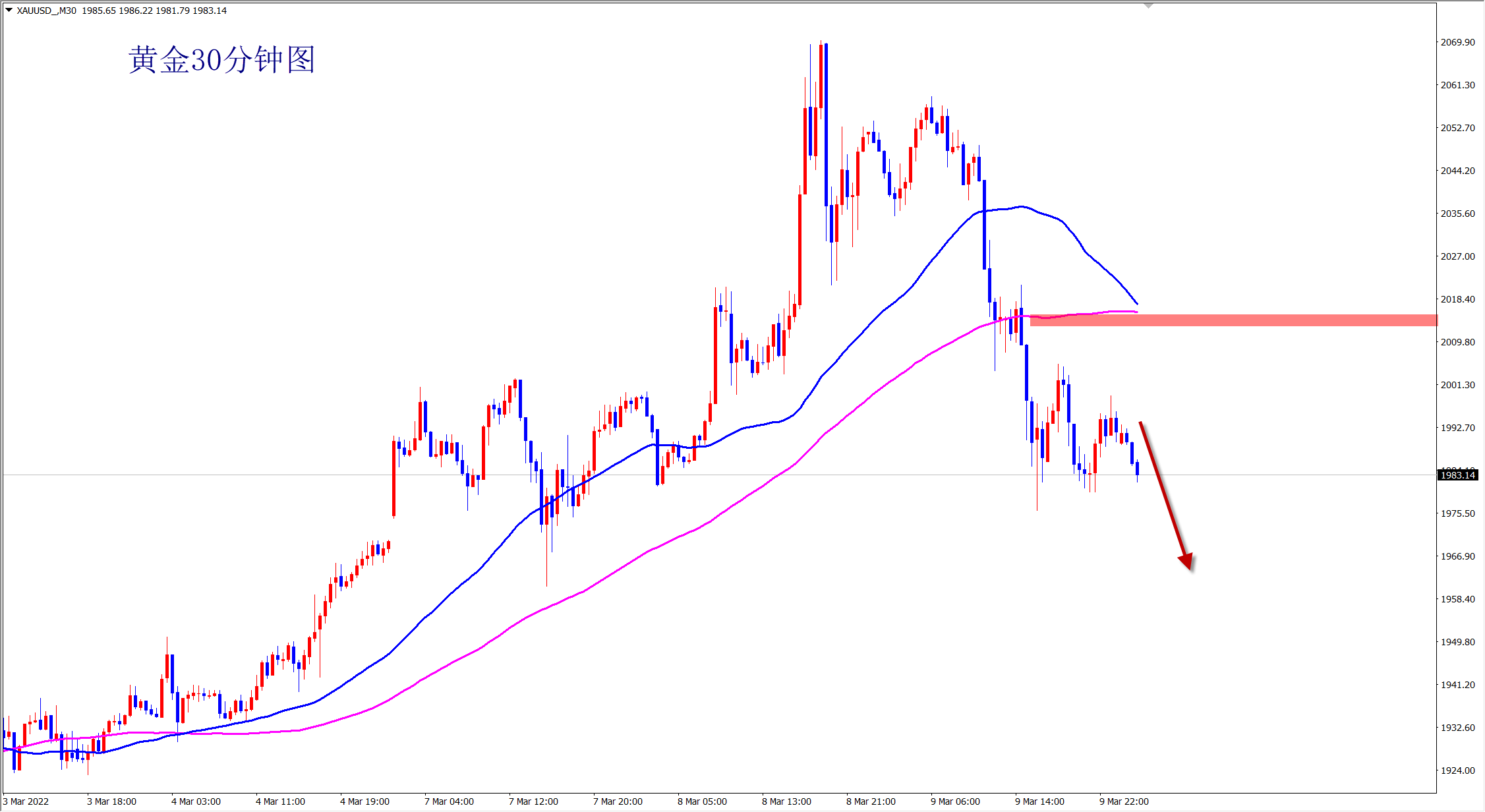 黄金上涨遇阻2074的压力后开始回调,昨日直接跌破2040的支撑,预示着行情要进行深度调整,最后再次的2000的关口,彻底转为空头下跌走势!当前行情继续下行,今日下方的支撑是1960!