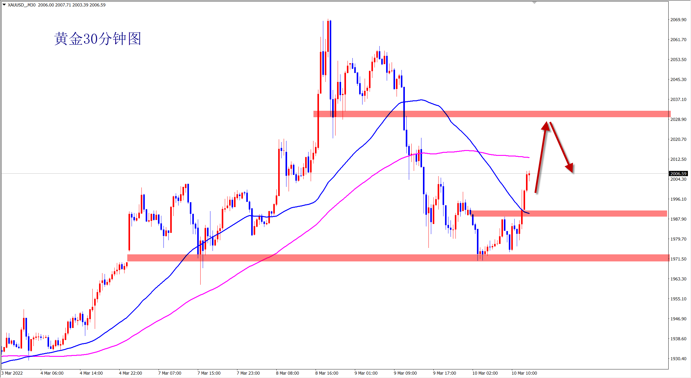 今日我们先是1980低多看涨如期大涨,随后欧盘俄乌谈判消息传来,没有实质性的进展,意味着冲突继续,黄金避险大涨拉升突破,涨势继续,美盘1988支撑上继续干多!