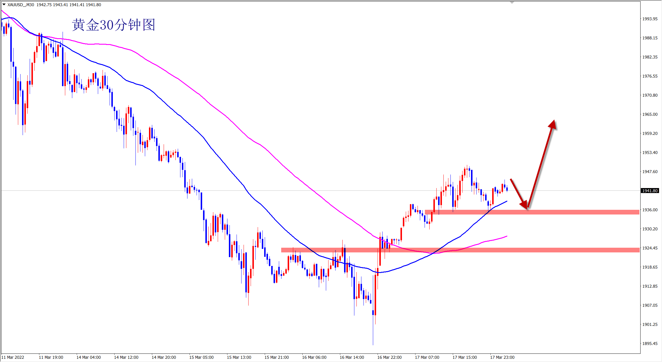 做多!仍是我们今日的主要操作思路和策略!做多是势,顺势而为!昨日遇阻后回调,但是在1935位置明显获得支撑,这将是我们今日干多看涨的重要支撑位置,此位置上方就是直接多!回踩蓄势,是为了再次突破新高!