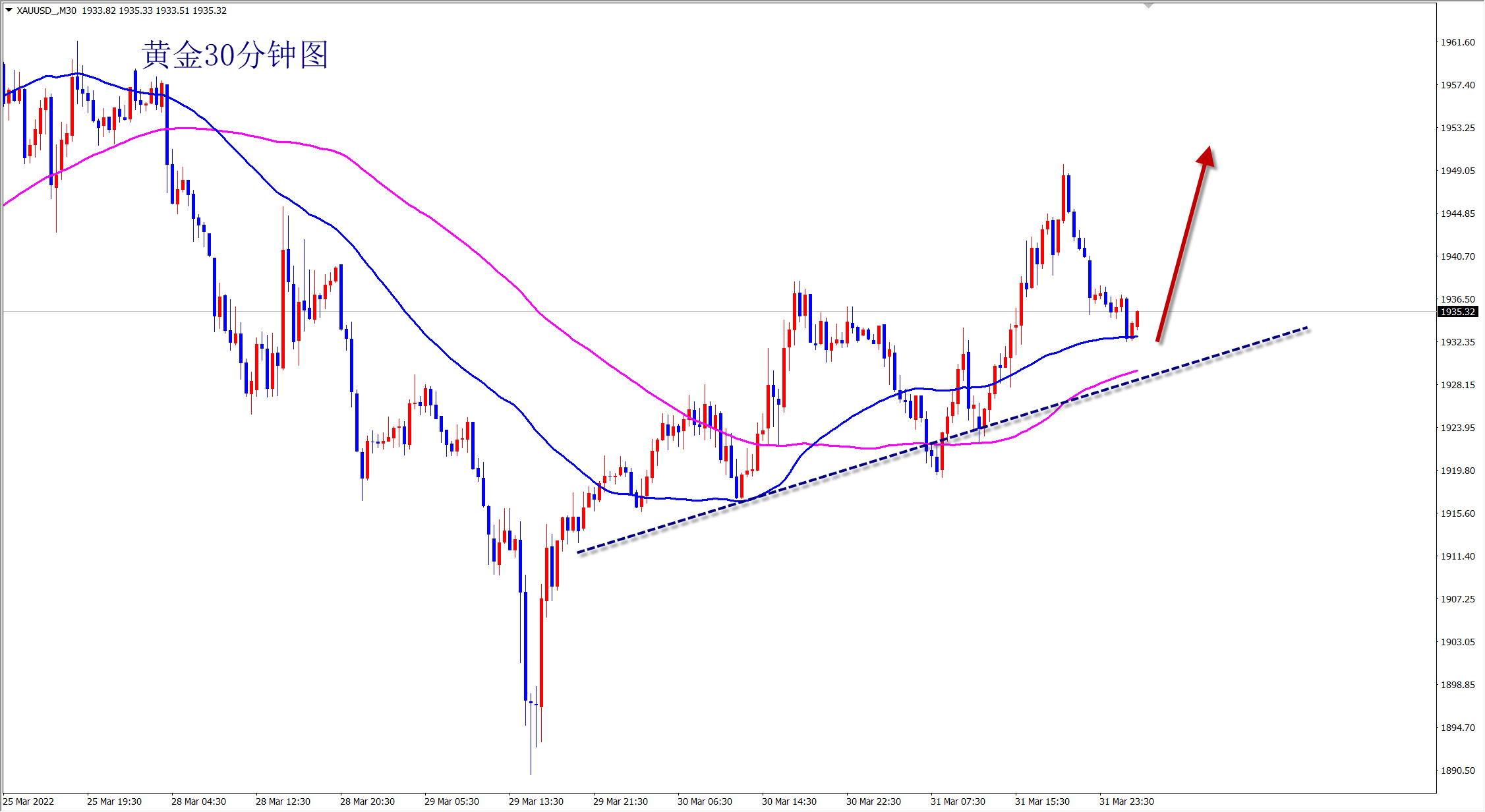 黄金30分钟上回调低点不断抬高,震荡上扬的走势,操作上还是以回踩低多为主,反复参与,会不断新高出现!昨日1948的目标已经达到!今日回落调整后还将继续拉升新高,继续干多!早盘依托30分钟均线支撑继续多!