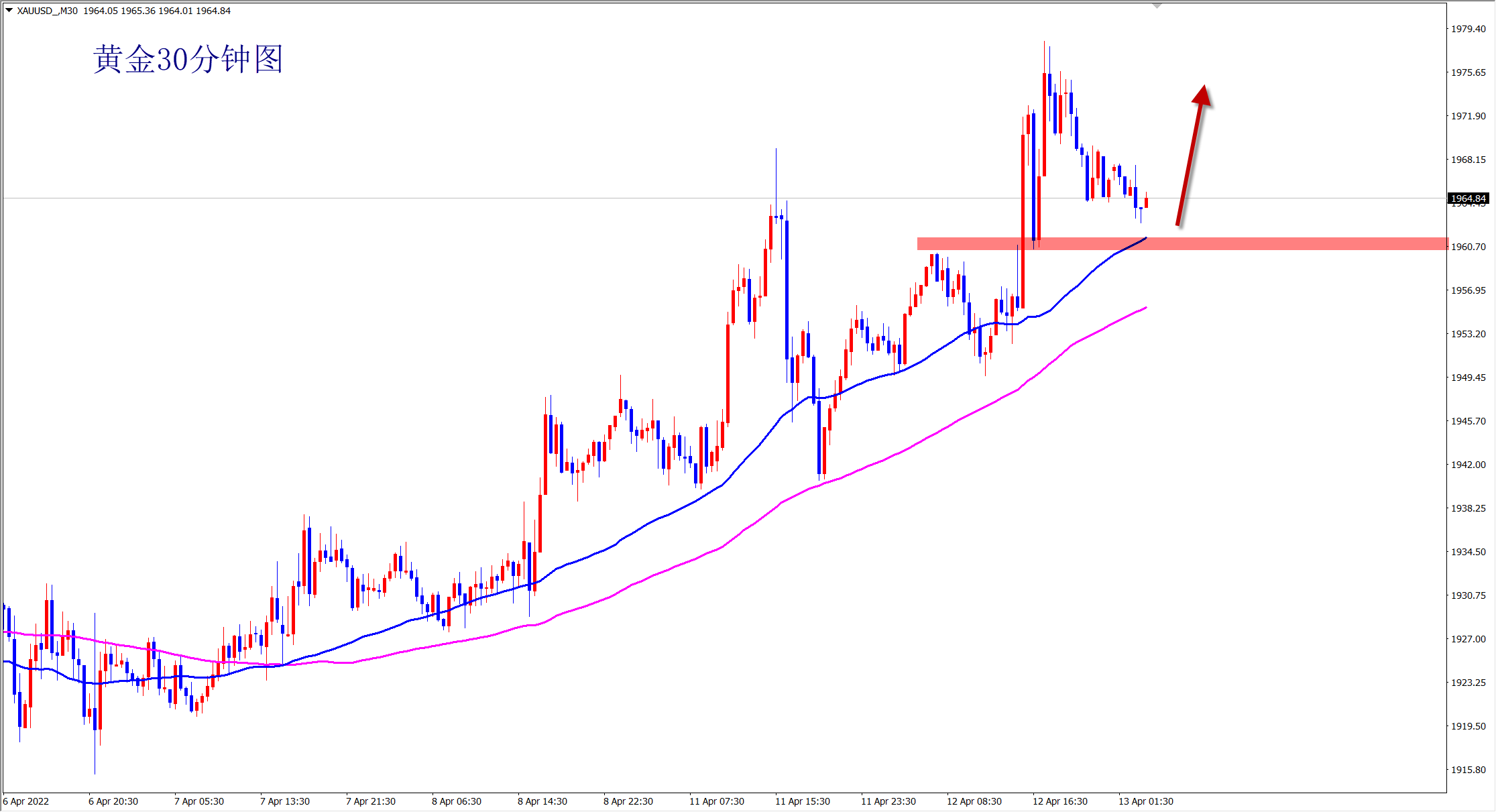 黄金当前属于明显的上涨趋势,也是突破底部盘整后的上涨波段,涨势还在继续,干多仍是我们的主思路!黄金30分钟级别上,均线呈平行排列,而K线受到均线支撑上行,上涨走势完好,趋势仍是涨!